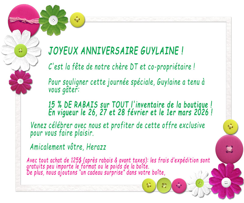 Nous vous invitons cordialement à vous abonner à notre Infolettre (au bas de la page) vous recevrez régulièrement un lien vers un tutoriel présentant des trucs, de l’information sur les produits ou une technique de scrapbooking et nous vous informerons sur les promotions et les nouveaux produits qui seront ajoutés à la boutique de scrapbooking Herazz.