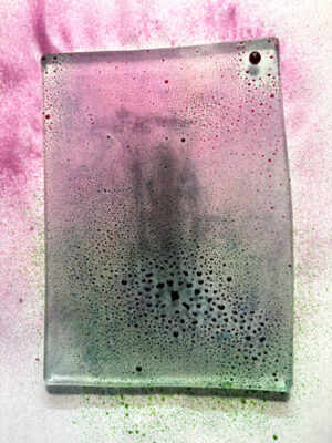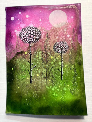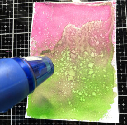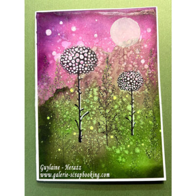 Pour cette démonstration, je l’applique sur une plaque de Gel Press, puis sur le carton mixed média blanc. Une fois appliqué, il ajoute une touche de féerie et de brillance, une couleur nacrée, scintillante et irisée à nos projets.