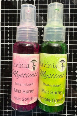 Le produit Lavinia Mica Spray (souvent appelé Mysticals Mica Mist Spray) est un spray exclusif à base d’eau, infusé de mica. Le Mica Spray est présenté dans un large inventaire de couleurs, permet de travailler sur différents médias comme le papier, le carton, le Yupo, la toile, le bois, la céramique et même le métal.