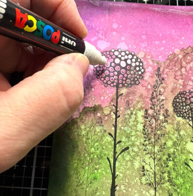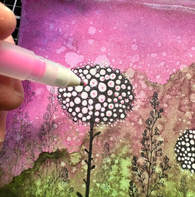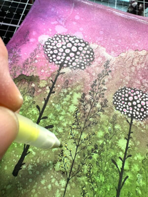 Avec le crayon Gelly Roll jaune, ajoutez des points jaunes dans la partie du bas (de différentes grandeurs).