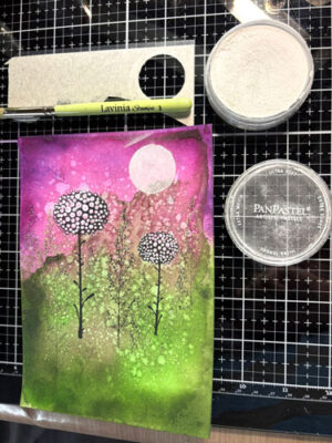 Découpez un petit cercle avec un papier de masquage. Conservez le petit cercle pour plus tard, prenez son négatif, le PanPastel blanc et une petite brosse Lavinia et ajoutez une lune dans le haut de l’image: