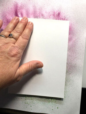 Prenez un papier blanc mixed media (ou carton, papier aquarelle, etc.) et déposez-le sur le Gel Press, frottez pour bien faire adhérer la couleur: