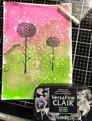 Note: Si vous utilisez des étampes dans vos projets, je vous conseille les encres Versafine Clair, elle épouse bien les étampes et nous montre tous les détails, c’est un incontournable. L’essayer c’est l’adopter.