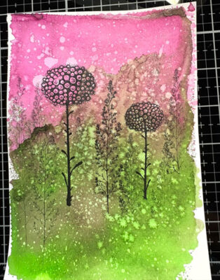 Pour donner une perspective, étampez une fois sur un papier brouillon et puis sur l’image, elle sera plus pâle donc aura l’apparence d’être plus loin: