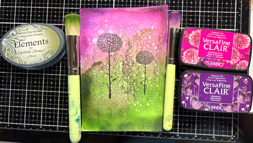 Puis à l’aide d’une autre brosse faites de même avec le tour de la partie du haut, un peu de Versafine Clair Rose Charmant, puis finissez avec un peu d’encre Versafine Clair Monarque comme ceci: