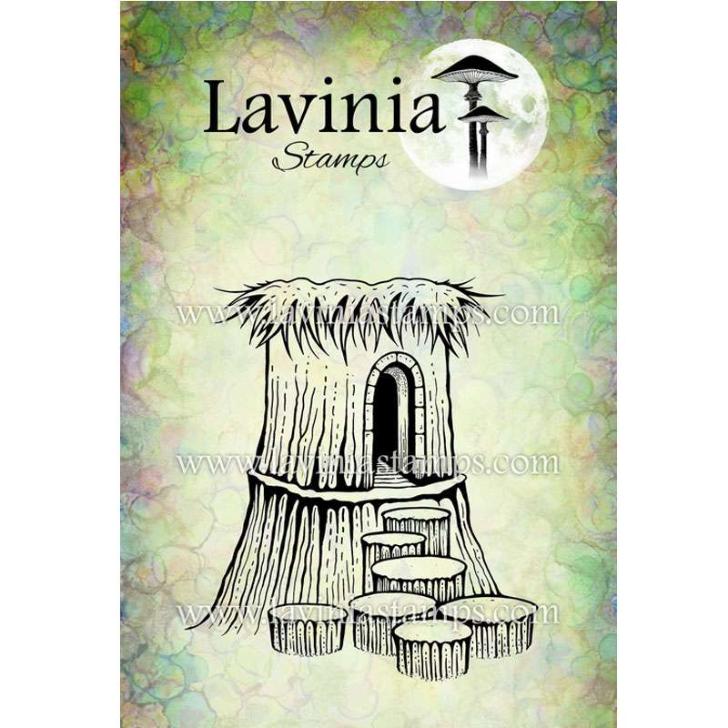 Une étampe fantaisiste représentant une mystérieuse demeure, incrustée dans une souche d’arbre, avec de petites marches taillées dans la souche menant à une porte.