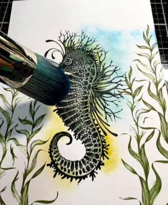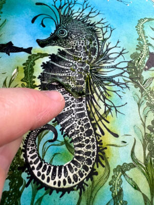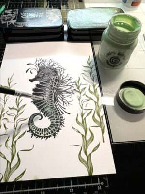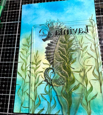 Pour débuter, étampez l’étampe Lavinia Sébastien l’Hippocampe avec l’encre Versafine Clair Nocturne.