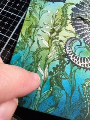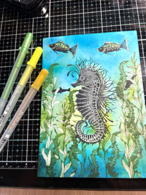 Ajoutez quelques poissons (étampe Lavinia Mini Poisson, et ensemble de poissons). Les mini poissons, pour la démonstration seront étampés sur les plantes recouvertes du masque. De cette manière, vous pourrez voir qu’ils se retrouveront en arrière plan.