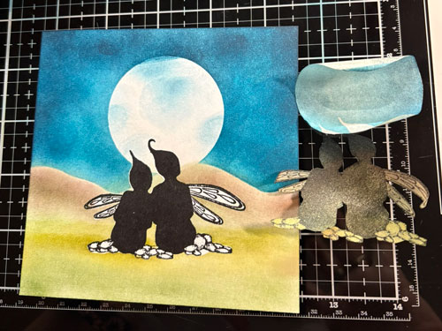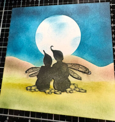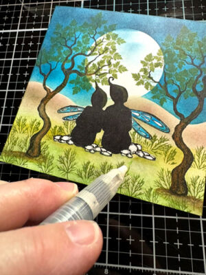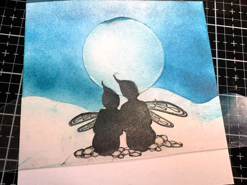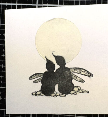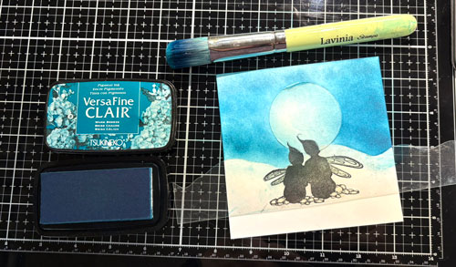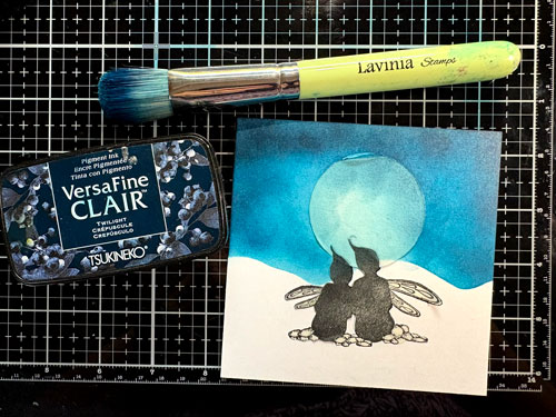 Avec la brosse Lavinia et l’encre Versafine Clair Brise chaude faites de petites taches sur la lune.