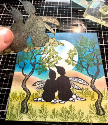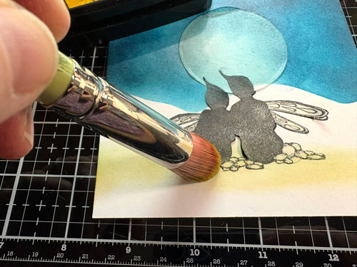 On met le stencil colline sur l’image, pour faire le ciel on se sert de l’encre Versafine Clair Brise Chaude et une brosse Lavinia: