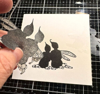 Découpez l’image sur le papier de masquage, enlevez la pellicule de plastique et collez l’image sur celle étampée: